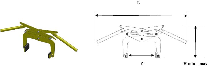 Uchwyt przeznaczony do podnoszenia ręcznego lub za pomocą zawiesia krawężników lub bloczków betonowych o wymiarach zgodnych z zakresem chwytania podanym w deklaracji zgodności. Uchwyt wyposażono w oczka do mocowania zawiesia dwucięgnowego. Zacisk proporcjonalny do podnoszonej masy.