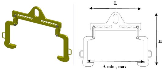 Trawersa przestawna z hakami Typ C do podnoszenia , transportu kręgów blach. Uchwyty Typ C są zawieszone na wyciętych karbach trawersy , pozwala to na szybkie i łatwe przystosowanie uchwytu do kręgów blach o różnej szerokości.