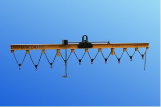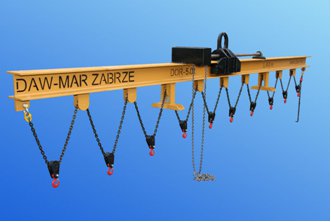 TRAWERSA UNIWERSALNA PRZEZNACZONA JEST DO TRANSPORTU ELEMENTÓW O ZMIENNYM POŁOŻENIU ŚRODKA CIĘŻKOŚCI I WIELU PUNKTACH ZACZEPOWYCH ZNAJDUJĄCYCH SIĘ NA RÓŻNEJ WYSOKOŚCI. ILOŚĆ HAKÓW ZACZEPOWYCH W ZALEŻNOŚCI OD POTRZEB. UCHO TRAWERSY MOŻNA USTAWIĆ ZA POMOCĄ NAPĘDU ŚRUBOWEGO CO POWODUJE SZYBKIE WYREGULOWANIE JEGO POŁOŻENIA DO ŚRODKA CIĘŻKOŚCI PODNOSZONEGO ŁADUNKU. UCHO TRAWERSY PROWADZONE JEST ZA POMOCĄ ROLEK TOCZNYCH.
