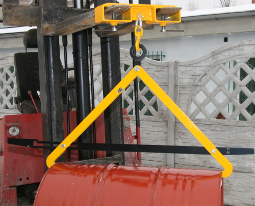 Na zdjęciu przedstawiono uchwyt Typ BK-50 DOR 500kg do podnoszenia i transportu beczek w pozycji poziomej oraz sposób jego mocowania na beczkach. Uchwyt zamocowany na uchwycie widłowym wózka widlowego Typ UW-1.
