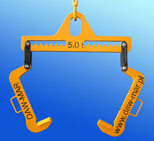 Trawersa przestawna z hakami Typ C do podnoszenia , transportu kręgów blach. Uchwyty Typ C są zawieszone na wyciętych karbach trawersy , pozwala to na szybkie i łatwe przystosowanie uchwytu do kręgów blach o różnej szerokości.